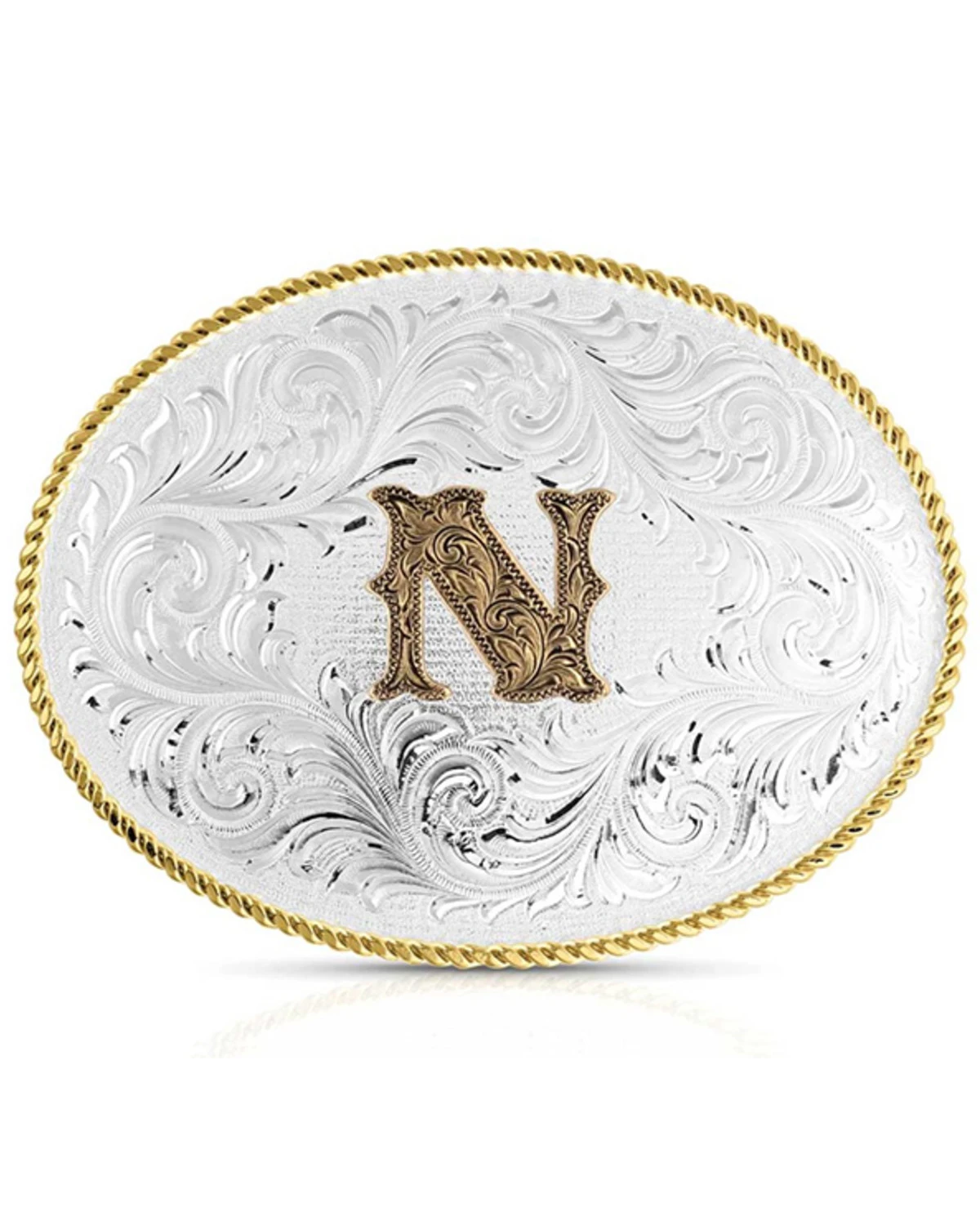 - Silver-toned oval buckle with gold roped border and “N” on front with silver-toned filigree details
