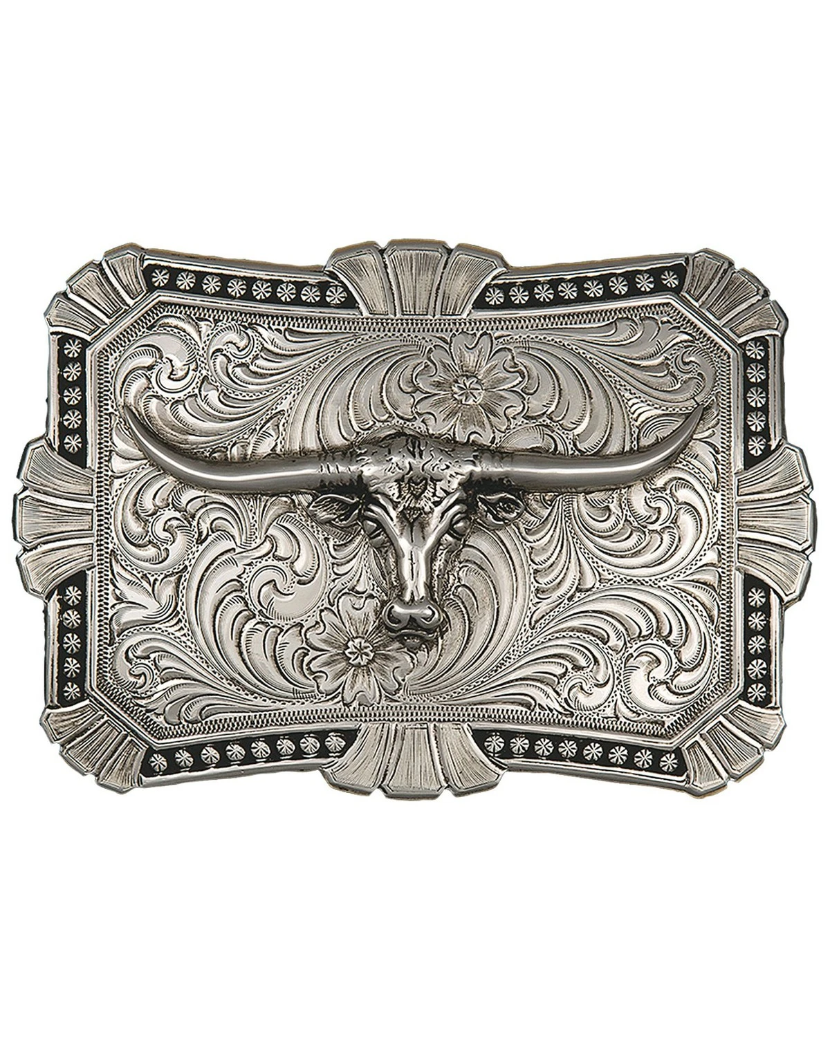 - Silver-tone longhorn at center pops against filigree egraving