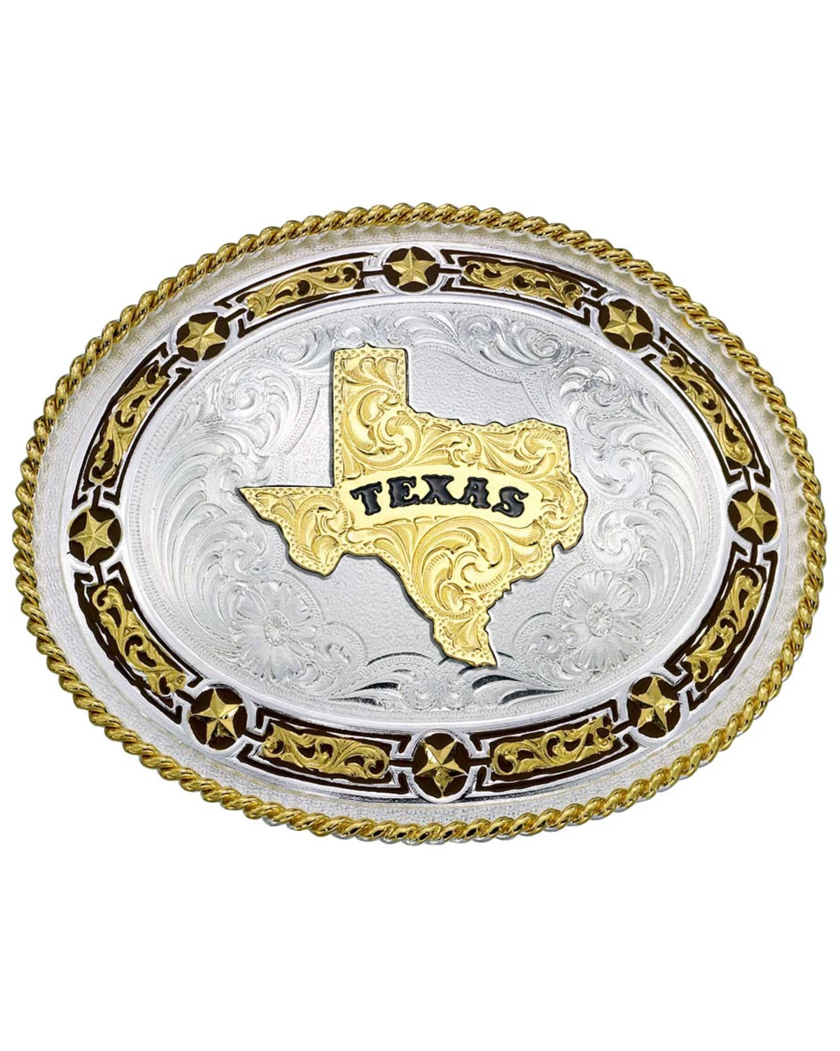 - Gold engraved Texas state shape applied to the center stippling surrounded with bright cut silver engraving with flower accents