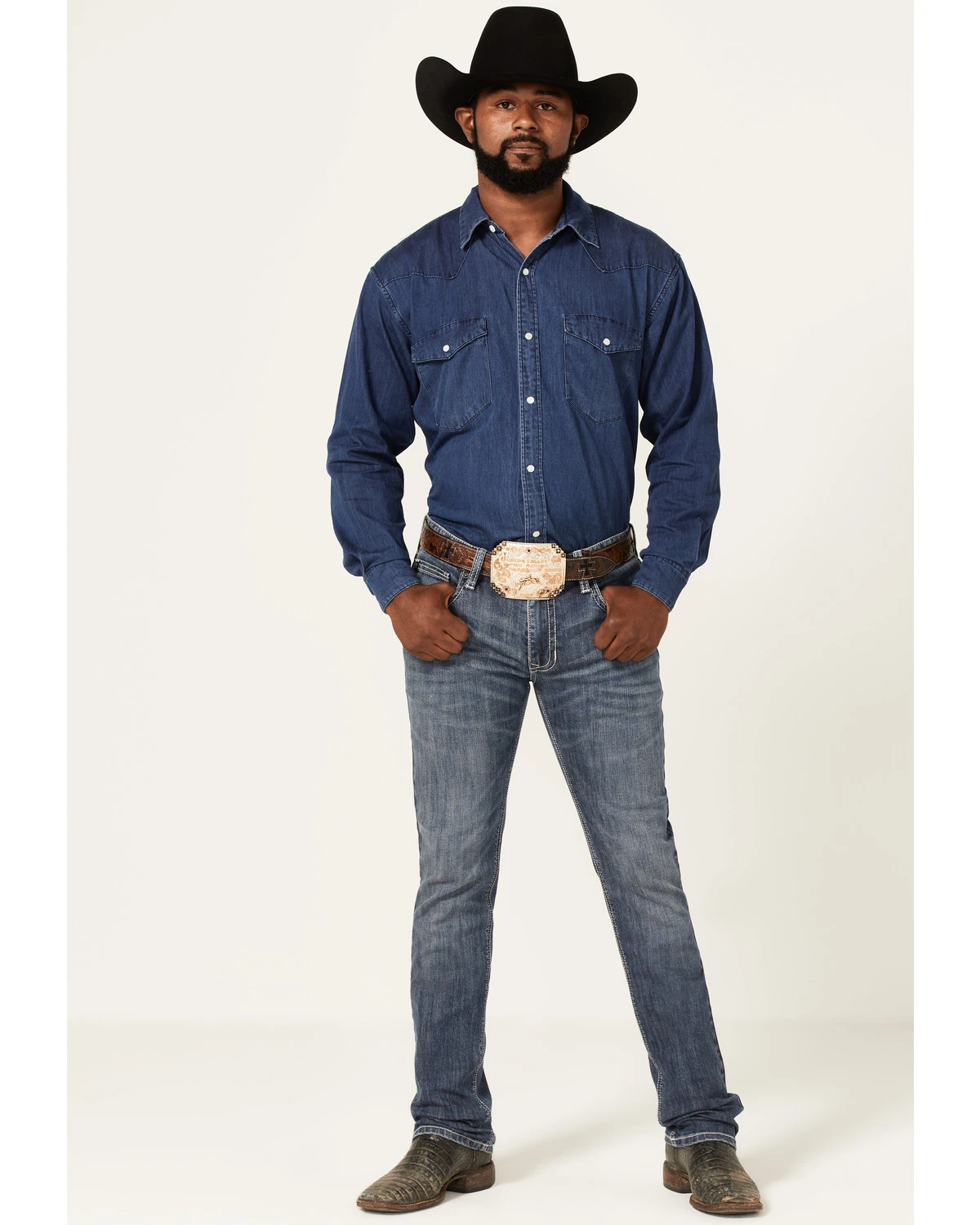 - Leather “V” stitching detailing on back pockets