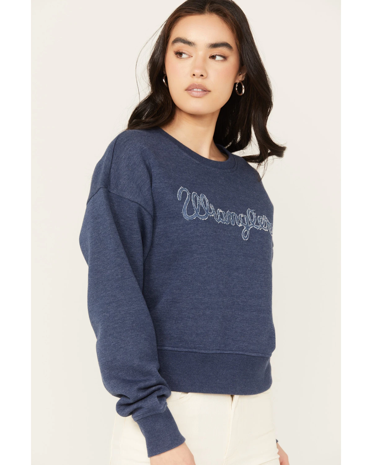 - Heather blue with denim “Wrangler” logo on front